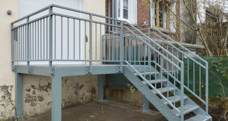 Plateforme avec sol en caillebotis en acier galvanisé, un garde corps en acier soudé métallisé et thermolaqué ainsi qu’un escalier avec marches en caillebotis.
